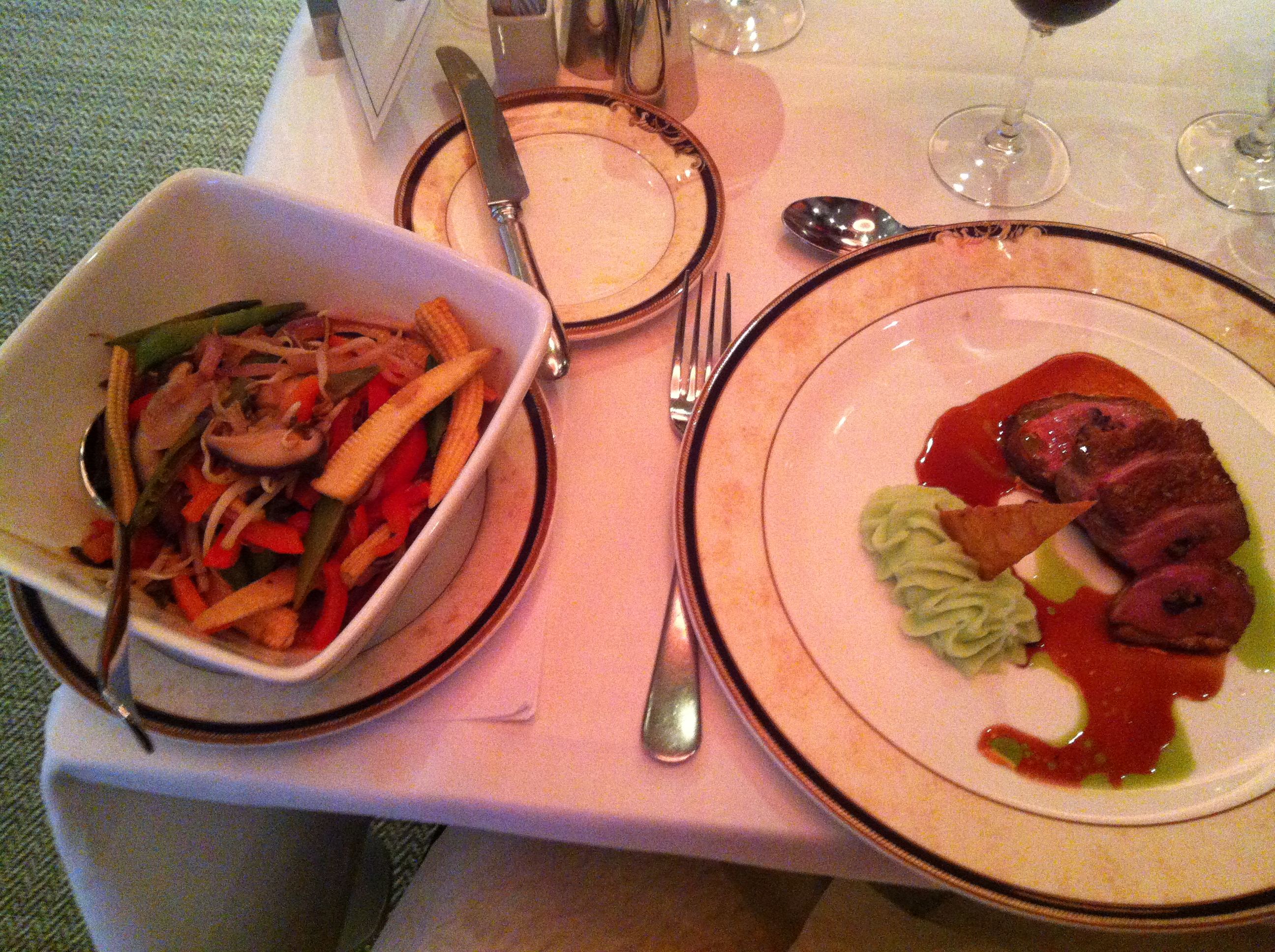 Cappuccino Curry Creme (Suppe, ich glaube allerdings das Cappuccino bezog sich auf die Konsistenz) mit frischem Zitronengras-Streifen und in Tempurateig gebackene Scampi, Entenbrust (fantastisch, perfekt gebraten) gefüllt mit in Sojasoße marinierten Shitakepilzen, serviert mit Wokgemüse, Kartoffelcreme (Püree) mit Maskarpone und Wasabi und Pflaumensoße Hoi Sin, Parfait aus dunkler Schokolade mit Chili, serviert mit Mangosorbet.