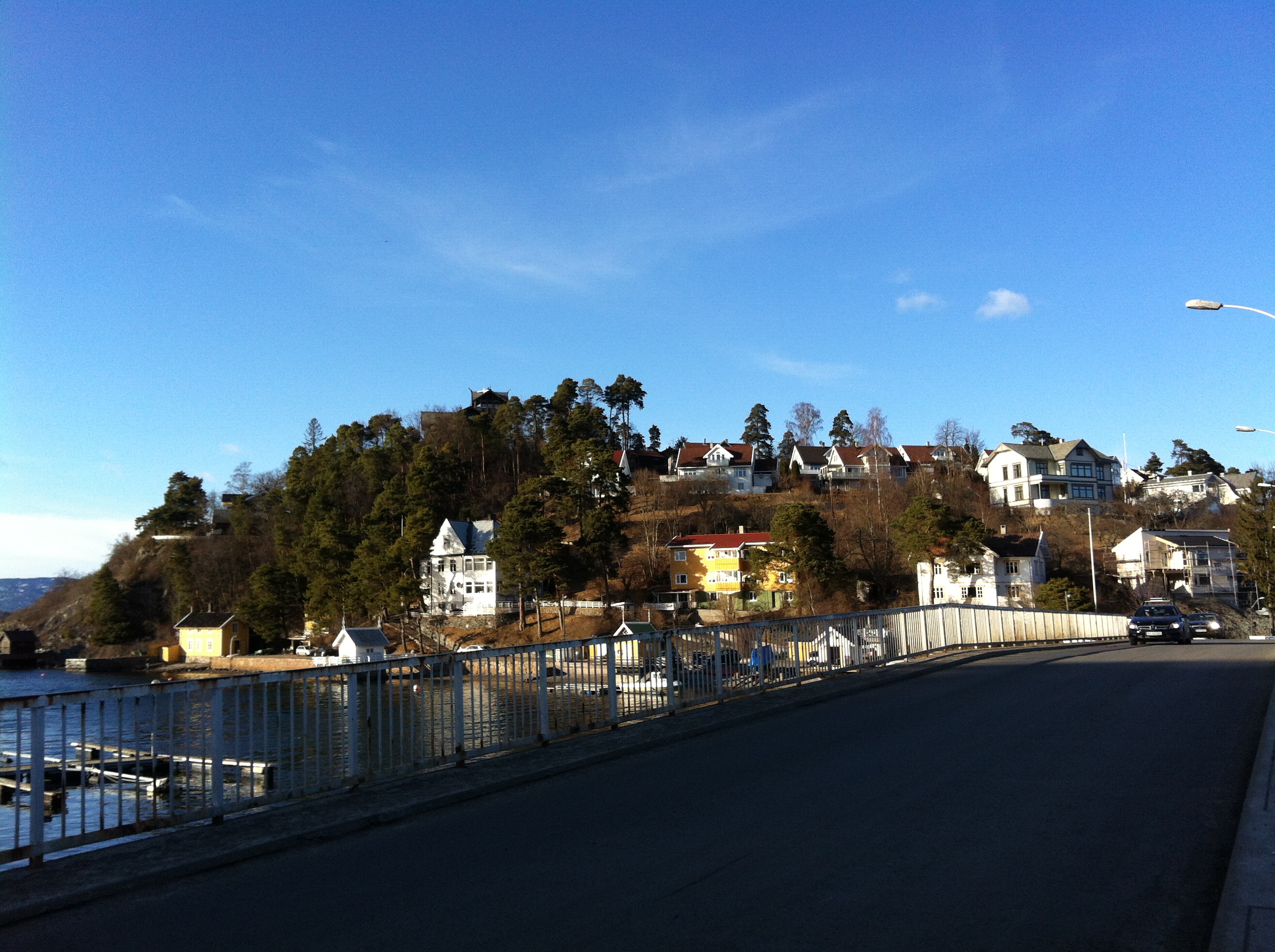 Da direkt vom Rikshospital die Trikk – Linie 18 (Straßenbahn) bis oberhalb von den beiden Inseln fährt bin ich die 13 km durch die Stadt gemütlich mit selbiger getuckelt (überarbeiten wollte ich mich nicht 😉 und die – im Wind – gefühlten 0° konnten mich für die lange Strecke auch nicht motivieren) und in „Holtet“ ausgestiegen. Von dort ging es dann über mehrere 170° Spitzkehren den Berg runter (ca. 120 Höhenmeter über dem Fjord gelegen) – coole Aussicht – am Hafen vorbei auf die Inselchen.
