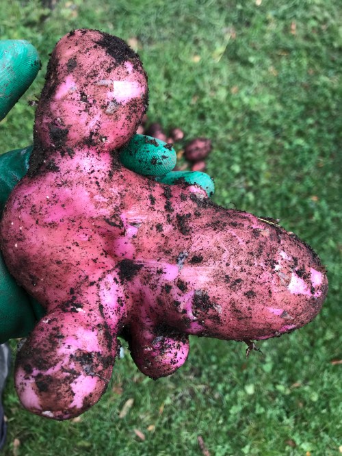 Anfang Mai hatte ich einige (7 oder 8) Kartoffeln zu lange liegen lassen, und sie haben das Treiben angefangen. Dann habe ich sie einfach an einer Stelle im Garten in die Erde gesteckt wo alte Blumenerde lag und habe sie immer wieder mit Rasenschnitt abgedeckt. Über den Sommer sind sie gut gewachsen und jetzt war Ernte: