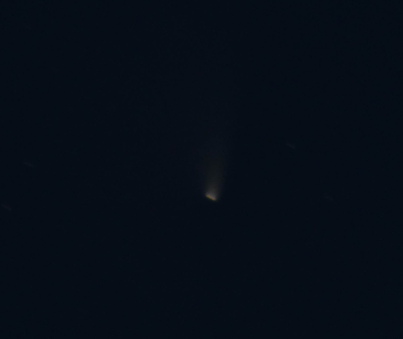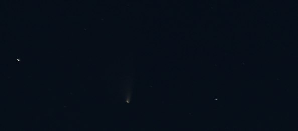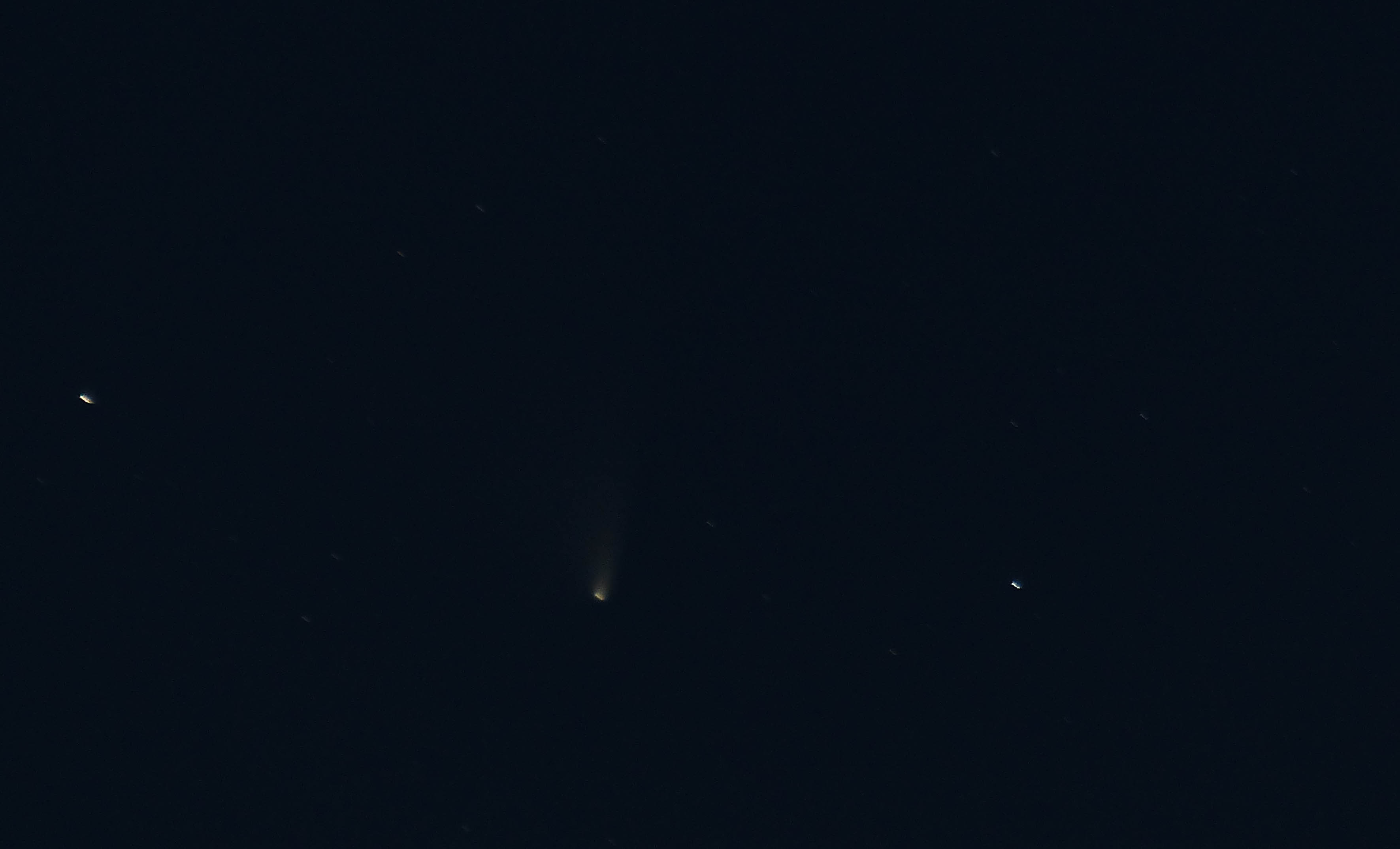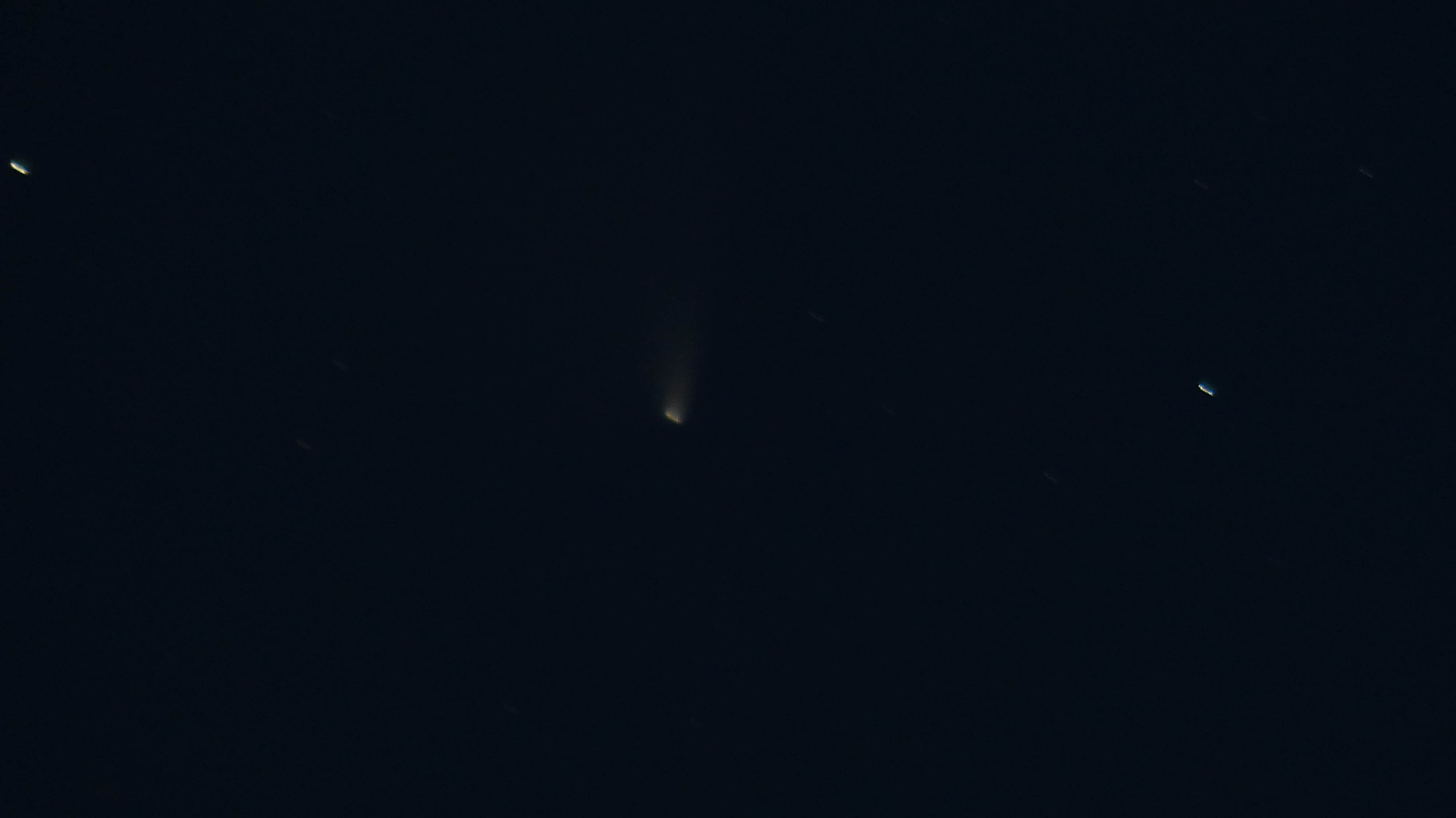 Pan-STARRS sollte zwischen Andromeda und Pegasus liegen, genauer zwischen dem Andromeda-Nebel (Sternbild Andromeda) und dem Stern Alpheratz (Sternbild Pegasus). Ich betone sollte, da ich ihn immer noch nicht fand. Einige Internet Recherchen später und immer wieder Richtung Nordwesten schauen habe ich ihn dann ENDLICH gefunden. SEHR klein und lichtschwach war er dann zu sehen. Es lag wohl an der Helligkeit der Dämmerung, dass es solange gedauert hat. Dann musste ich noch einen Standplatz für mein kleines Stativ suchen, die Kamera auspacken und schnell Bilder knipsen. Schnell deswegen, weil sich der Akku bei der Kälte schnell verabschiedet. Aber mir sind einige Bilder gelungen. Da die Kamera einige Sekunden lang belichten muss, erscheinen die Sterne und der Komet etwas langgezogen. Ich habe leider kein Geräte mit dem man die Erdrotation umgehen kann (gibt es, sind aber teuer). Hier sind die Ergebnisse: