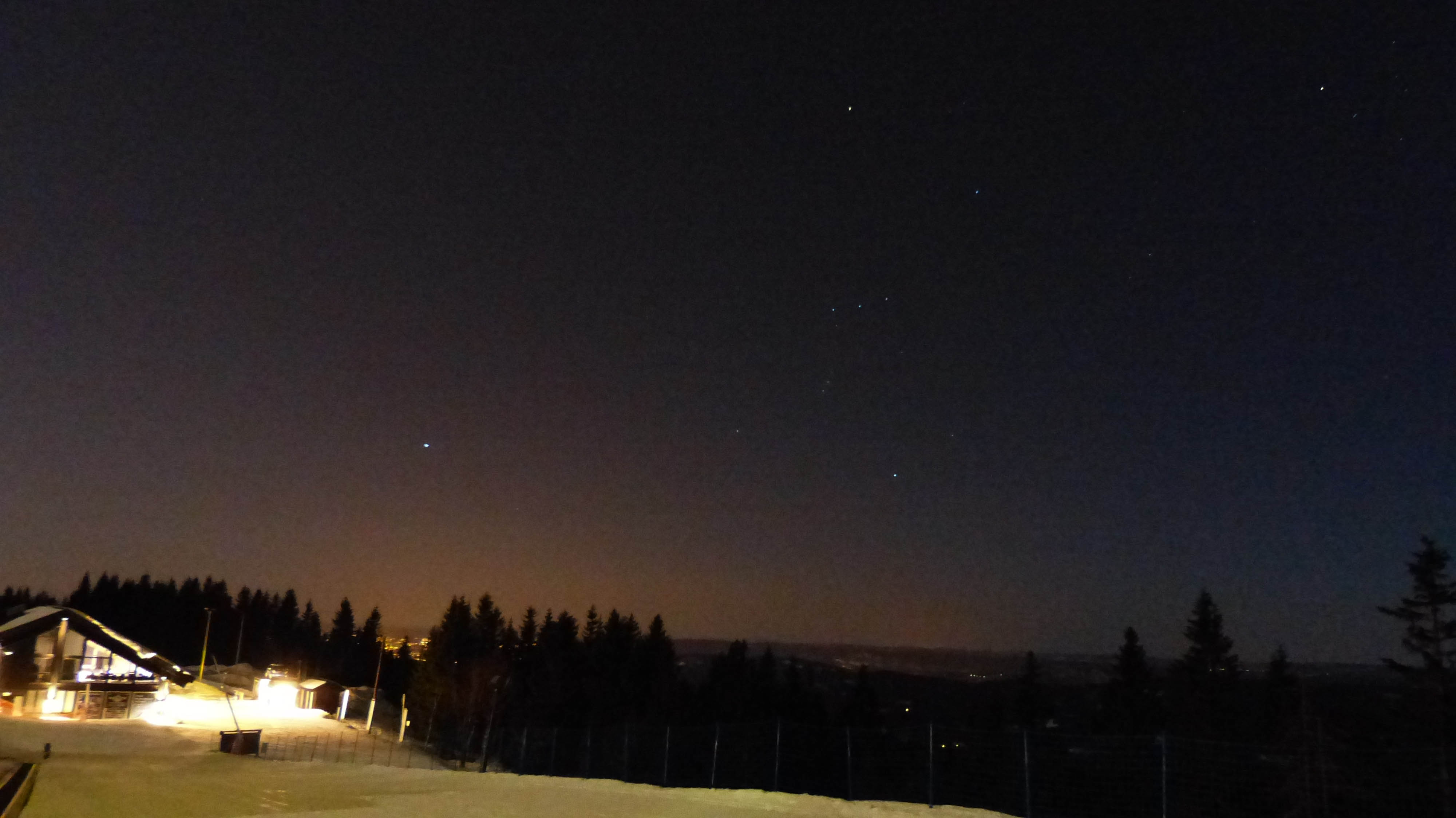 OK, meine Begeisterung für Astronomie hat mich dann am Dienstag Abend (26.3) nochmal rausgetrieben. Ich hatte gelesen, dass ich immer zu früh dran war. Er solle zwischen 19:30 und 20:00 am besten zu sehen sein. Dick eingepackt – hier lernt man schnell, wie das optimale Zwiebelschalenprinzip funktioniert. Und ganz wichtig: Sportunterwäsche!! – Kann ich wärmstens (hehe schönes Wortspiel) empfehlen. … wo war ich stehen geblieben, ach ja, Dick eingepackt bin ich dann an meinem Arbeitsplatz vorbei mit der T-Bane auf den Frognerseteren hochgefahren. Dieser Bergrücken oberhalb vom Holmenkollen hat Richtung Nordwesten am Tryvann (dort steht auch der Fernsehturm) ein kleines Skigebiet (Oslo Vinterpark) mit sehr viel freier Fläche und ich nahm zurecht an, dass man von dort eine gute Aussicht hat. (Eigentlich wußte ich es von einem Ausflug dorthin bei meinem Praktikum 🙂 )  Oben angekommen kam es mir auch zum ersten Mal in diesem Winter NICHT bitterkalt vor – will heißen, es herrschte fast kein Wind. Und es war wolkenloser klarer Himmel! Traumhafte Bedingungen.