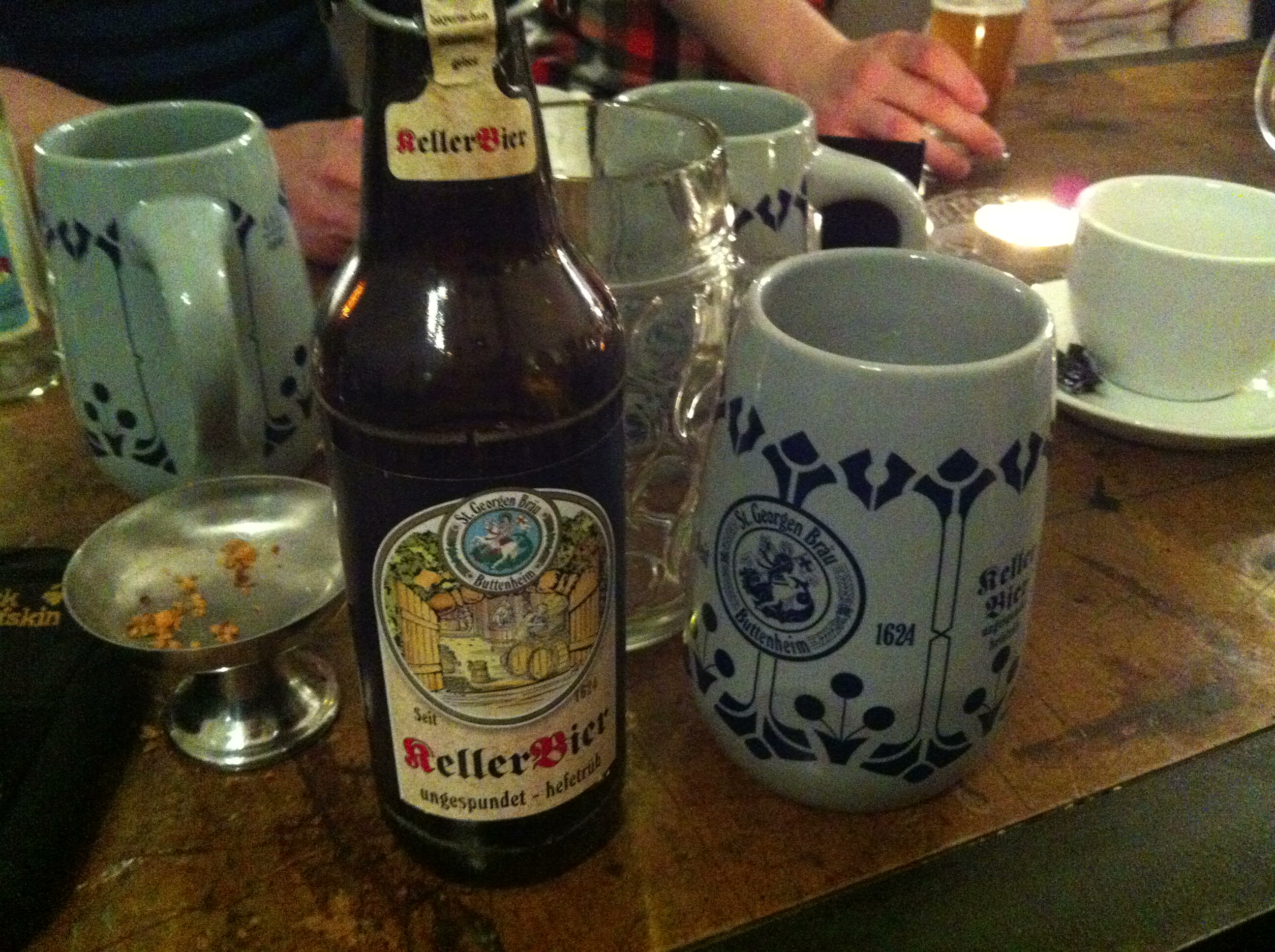 Letzte Woche war ich abends bei den „Jungen Erwachsenen“ der deutsch-norwegischen Gesellschaft zum „Språkkafe“ eingeladen – im Cafe „Liebling“ (von einer Nähe Passau kommenden Auswanderin betrieben) und was finde ich dort als leckeres Getränk: St. Georgen Kellerbräu aus der Nähe von Erlangen (allerdings zu dem Preis hätte ich in D. fast einen ganzen Kasten bekommen):